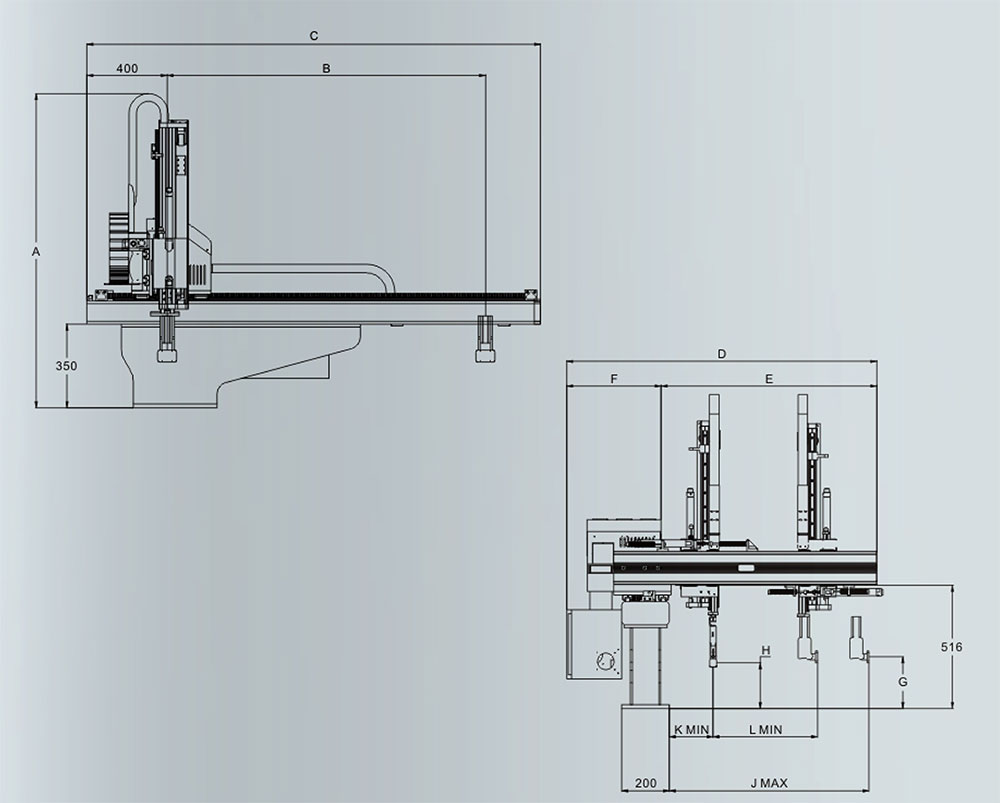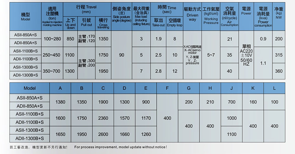 A-series sidle manipulator series is mainly used in the 100-700T horizontal injection molding machine finished out, using double sectional type arm, can increase the jib for three die heard out, with AC servo motor drive, drawing, drive under pressure, the stroke adjustment and position adjustment mode with manual adjustment (standard) and electric adjustment (optional) two, equipped with standard suction and holding fixture.